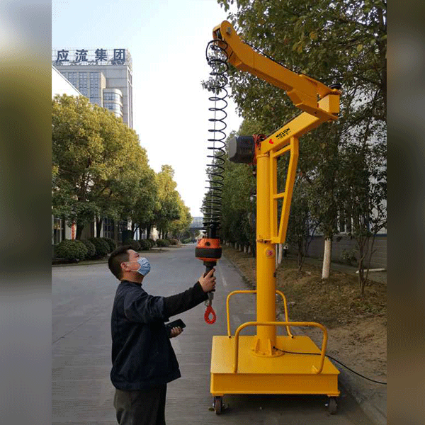 Intelligent lifting goose-neck jib crane is a kind of jib crane whose jib can be folded and whose lifting mechanism is an intelligent servo hoist. It is mainly composed of a column, a main jib, an auxiliary jib and an intelligent servo electric hoist. The main jib of the crane can rotate around the column, and the auxiliary jib can rotate around the main jib, but the gyration is manual. The picking device of the electric hoist can be equipped with slings, clamps and suction cups, and the control can be equipped with coaxial pressure handle, coaxial sliding handle, full touch handle, continuous variable transmission (CVT) handle, wireless remote controller, etc. According to different operating conditions, various functions can be set through the expansion port to realize customized services.