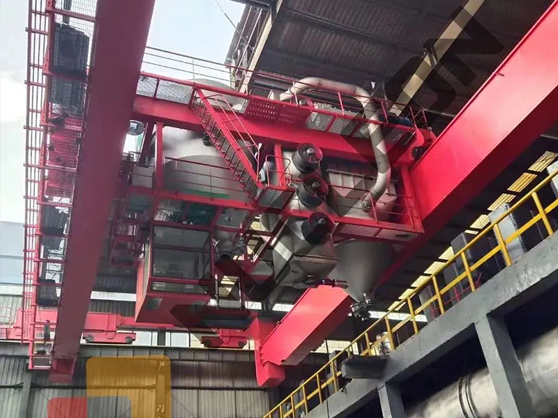 (5)其他輔助吊運(yùn)工作 小車上裝有輔助吸料管,可清掃煙道、排除粉塵。橋架上備有10t電動葫蘆,進(jìn)行燃燒器的搬運(yùn)及焙燒爐的維修保養(yǎng)工作。